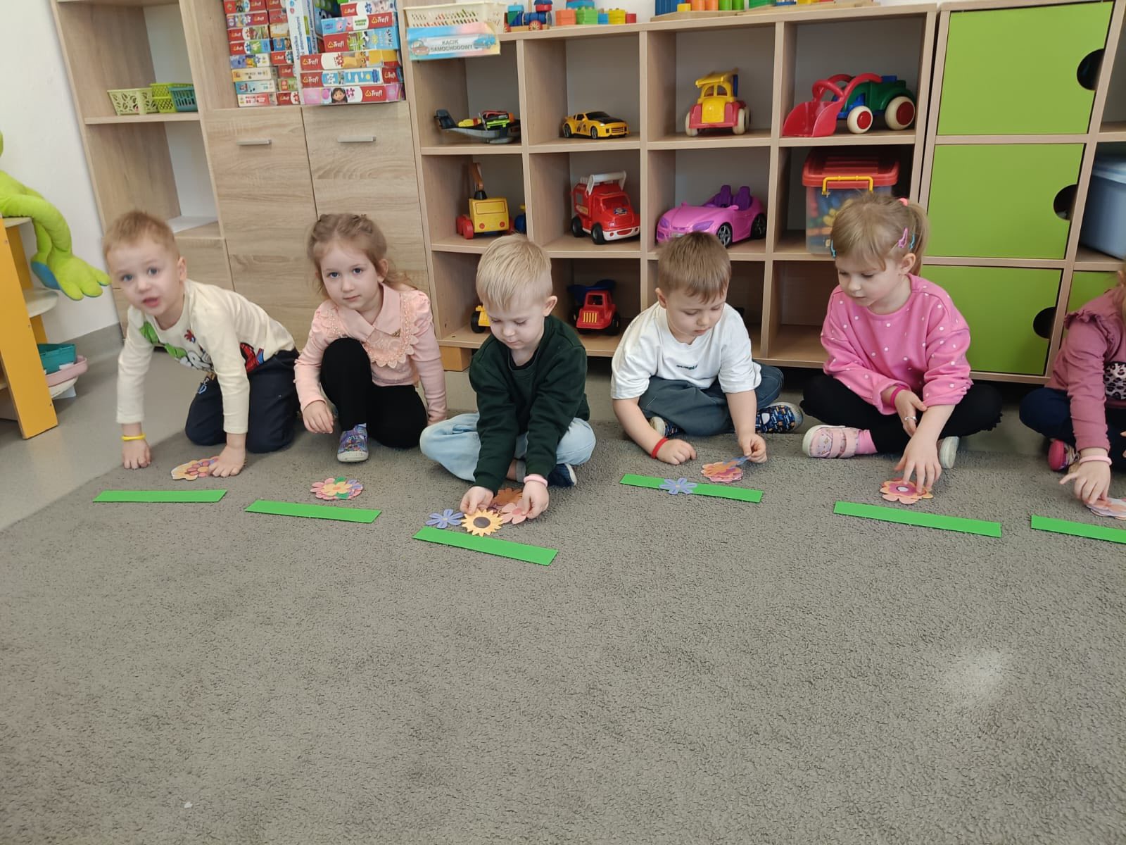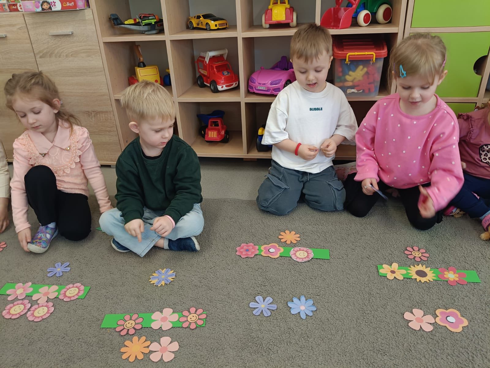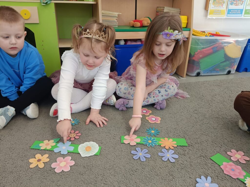 Dywan pani wiosny Dywan Pani Wiosny – zajęcia matematyczne dzieci z grupy Żabki doskonalili umiejętności rozumienia stosunków przestrzennych,przeliczali i określali prawa i lewa strona.