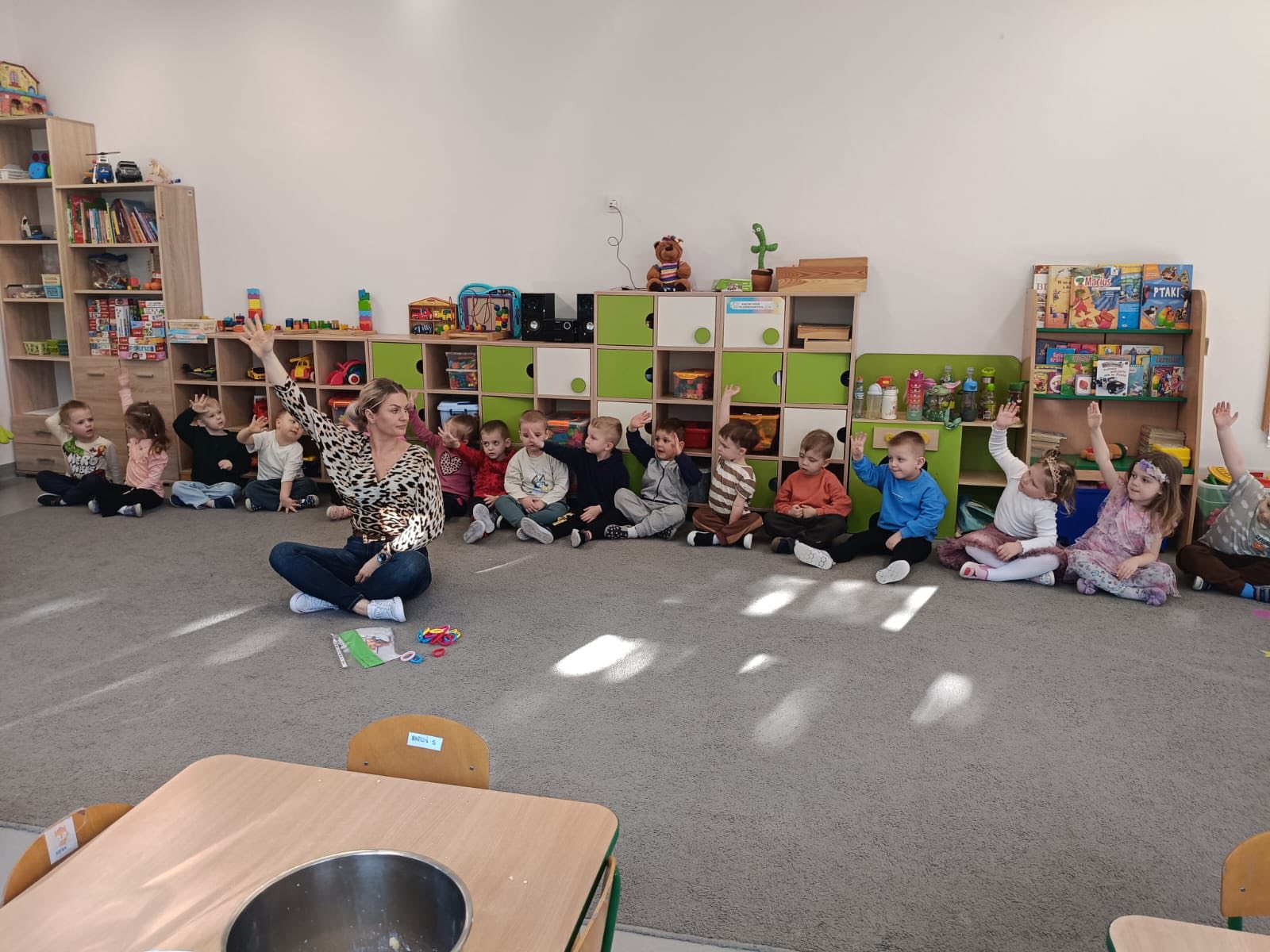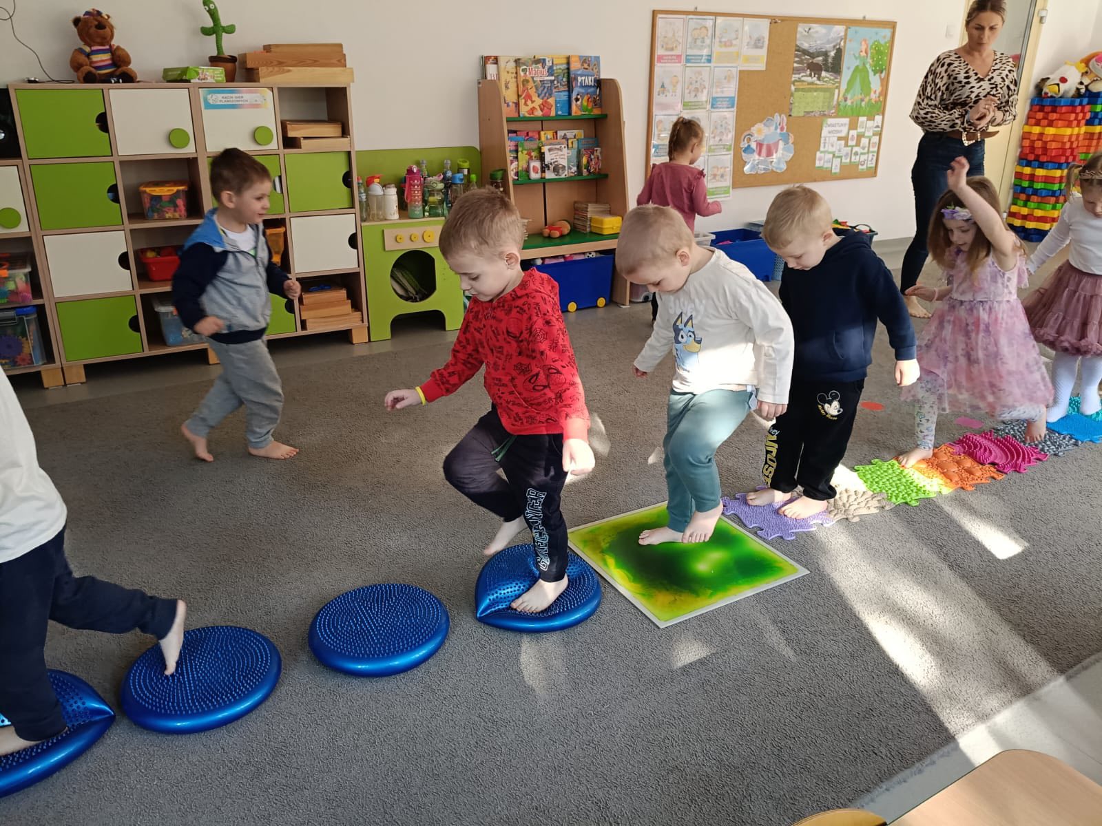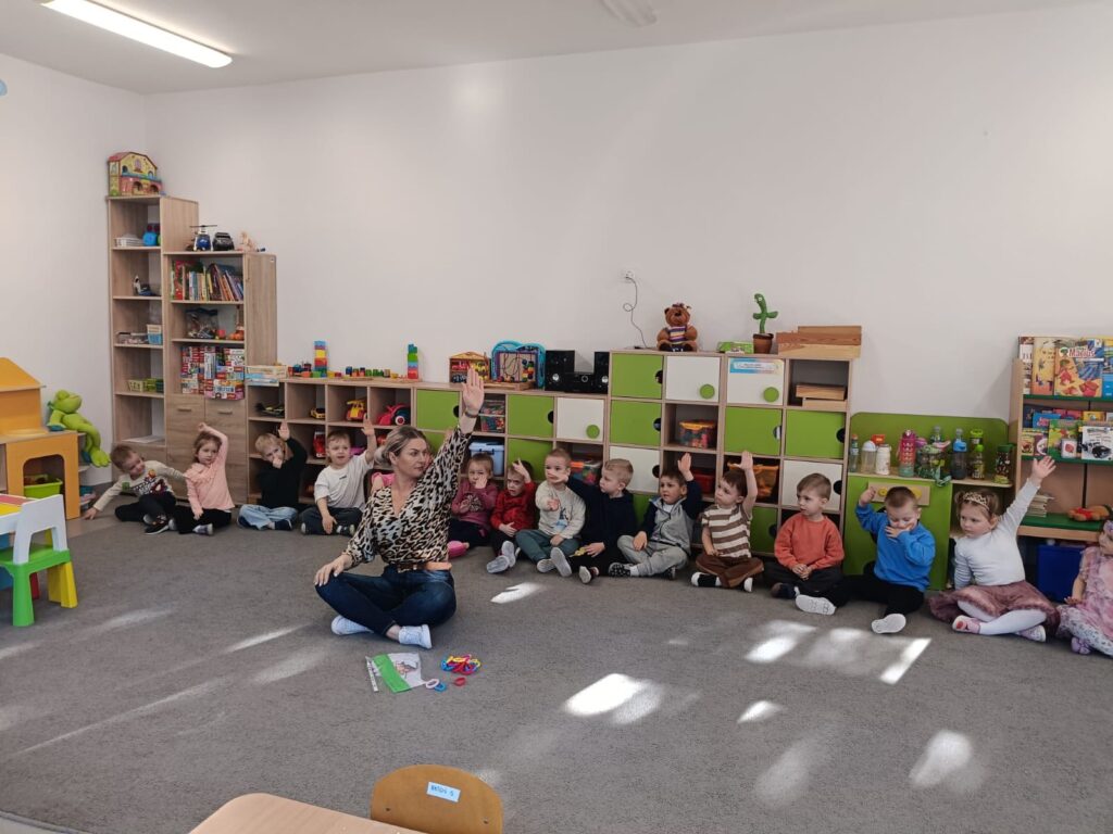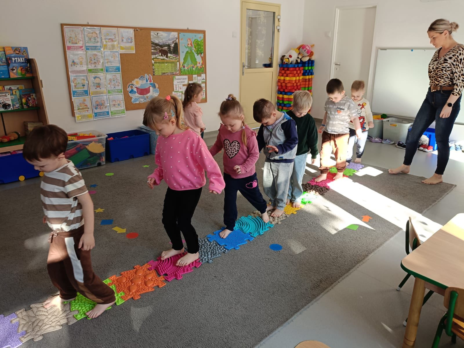 Dywan pani wiosny Dywan Pani Wiosny – zajęcia matematyczne dzieci z grupy Żabki doskonalili umiejętności rozumienia stosunków przestrzennych,przeliczali i określali prawa i lewa strona.