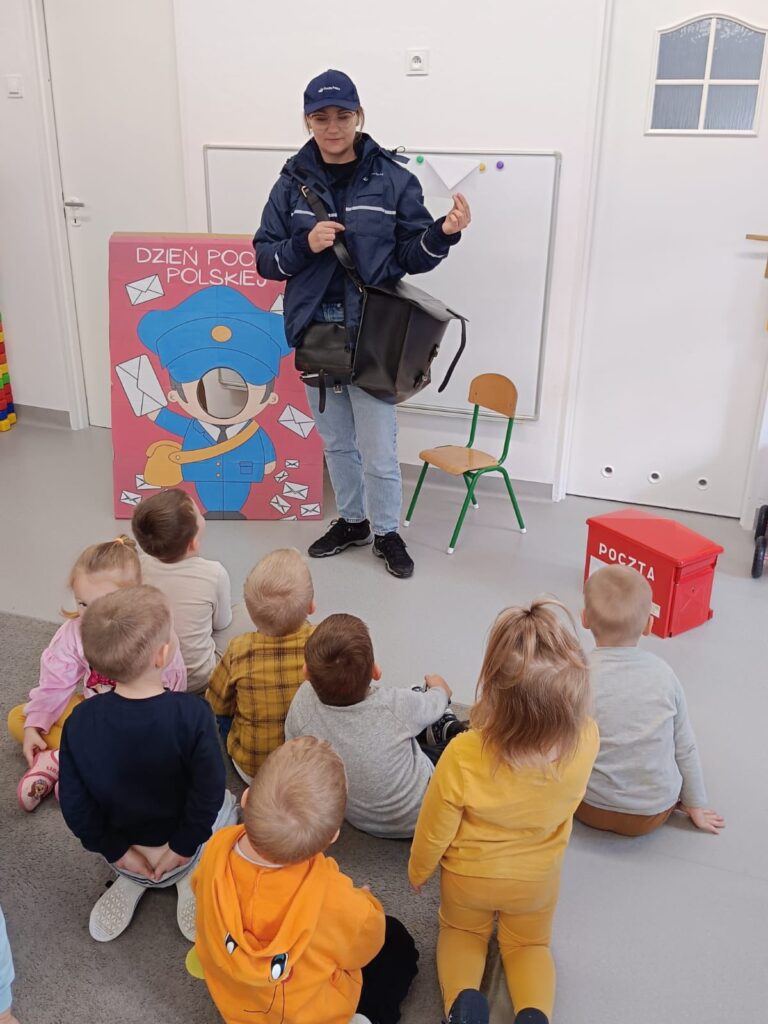 zaprosiła gościa specjalnego – Panią listonosz Edytę, pracownika poczty. Dzieci mogły zobaczyć mundur pocztowy i logo poczty. Dzieci miały okazję ozdobić jak również przykleić znaczki na koperty i wrzucić do skrzynki.Przedszkolaki dowiedziały się, jak trudna i odpowiedzialna jest praca doręczyciela pocztowego. Nasz gość również przeczytał nam bajkę, którą dzieci z zainteresowaniem słuchały.